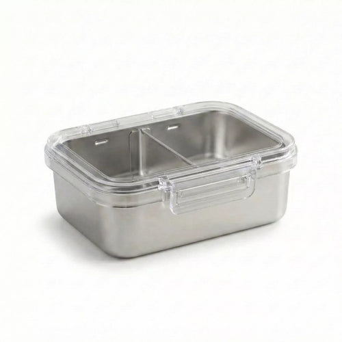 A single open compartment with a solid steel lid and metal latch clips. Made entirely from 304 stainless steel. No silicone. No plastic. Nothing but steel. Choose this when you want the purest option.