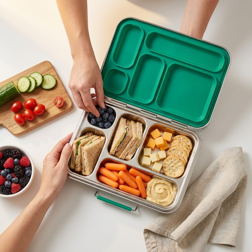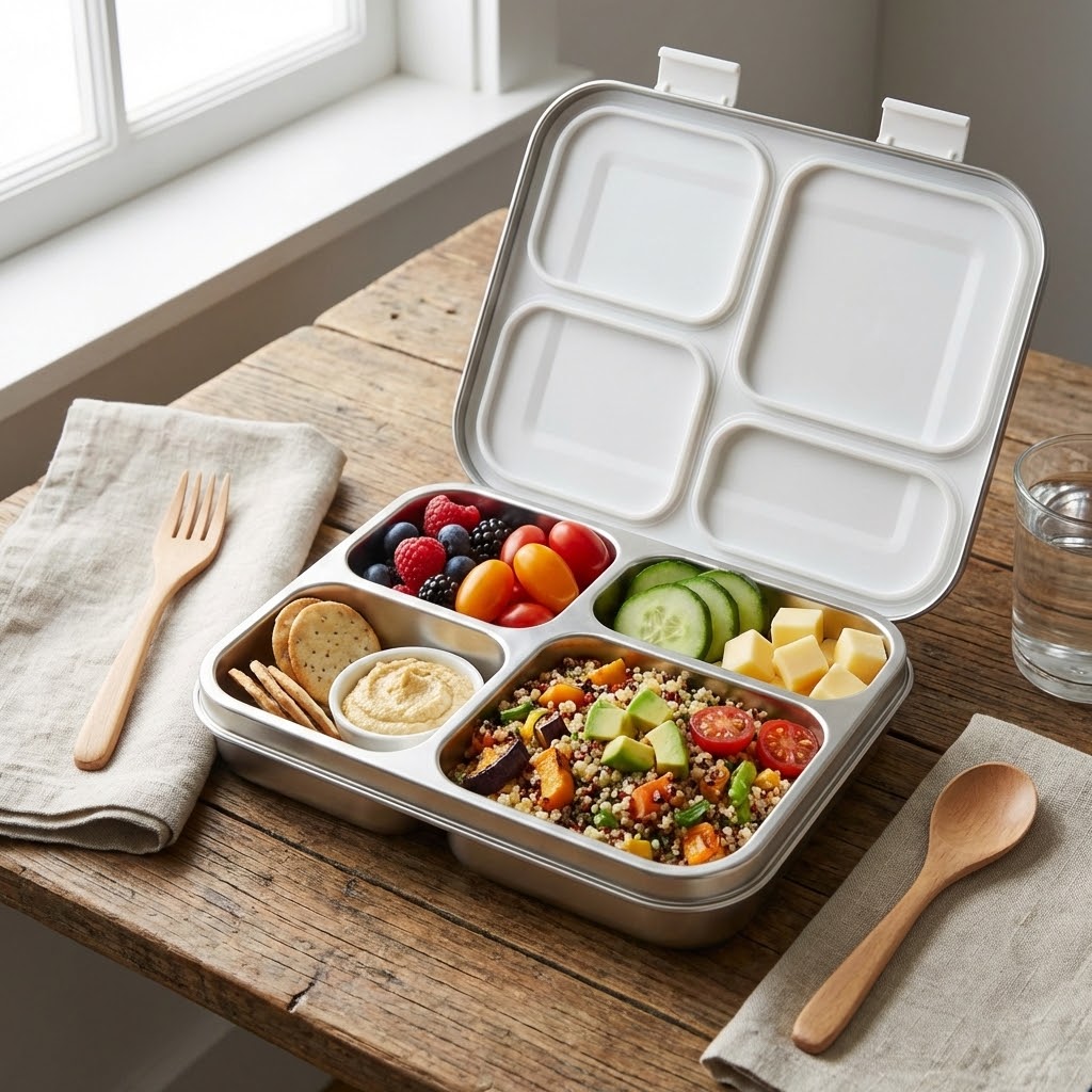 Four-section layout for balanced meals that stay organized from prep to lunch bell.